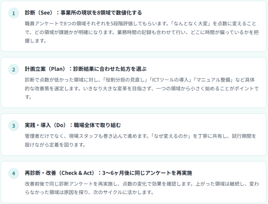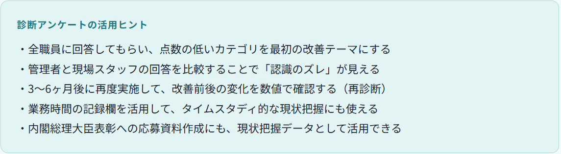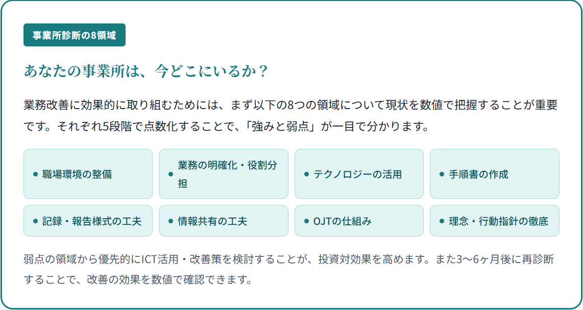 業務改善は「大きなシステムを導入すること」が目的ではありません。職員一人ひとりが「今の仕事に問題がある」「こう変わればもっとよくなる」と気づき、対話できる環境をつくることが、DX・ICT活用を成功させる最初の土台です。まずはこの診断アンケートで、あなたの事業所の「今の姿」を可視化することから始めてみてください。