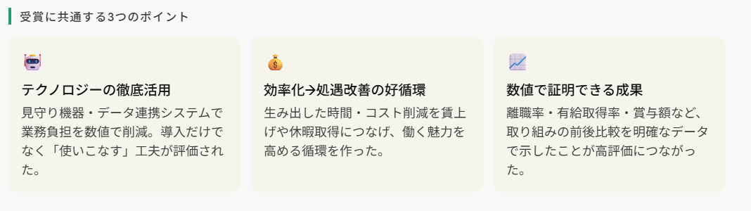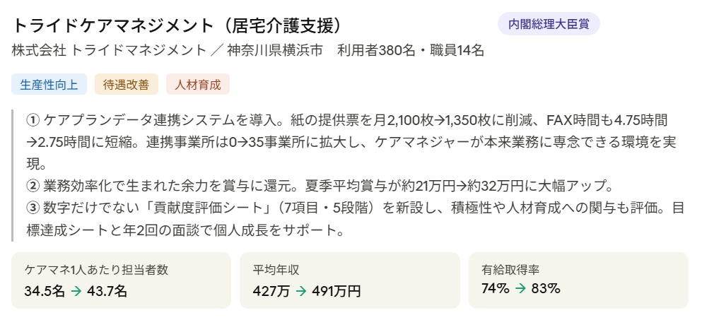 「DXを進めよう」と言われても、何から始めていいか分からない——そう感じる方も多いはず。ここでは、国が公式に認めた「先進事業所」の取組から、業務改善が職員の待遇改善にまで直結することを見てみましょう。