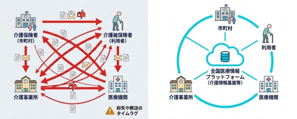 「介護情報基盤」の整備とマイナンバーカードを活用した認証システムの導入は、単なるペーパーレス化にとどまりません。多職種連携を劇的に円滑化し、現場の業務負担を根本から解消する、経営戦略上の大きな転換点となります。