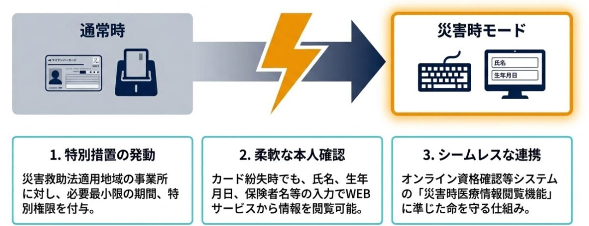 さらに、BCP(事業継続計画)や災害時の対応としても優れています。災害時には利用者が被保険者証を持たずに避難するケースが想定されますが、「災害時モード」を利用することで、マイナンバーカードを持参していなくても氏名や生年月日等を入力するだけでシステムを閲覧できる特別措置が検討されています。これにより、避難先や他の施設で利用者を受け入れる際にも、迅速に正しい情報を把握できるようになります。