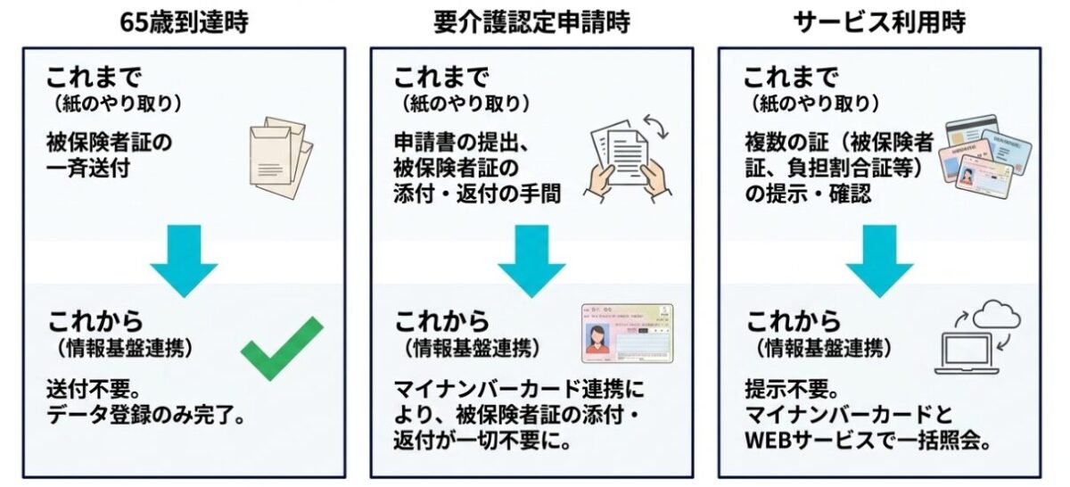 介護情報基盤の稼働に伴い、現場での運用も大きく変わります。とくに注目されるのが「介護被保険者証のペーパーレス化」と、「マイナンバーカードを利用した認証端末(カードリーダー)」の導入です。