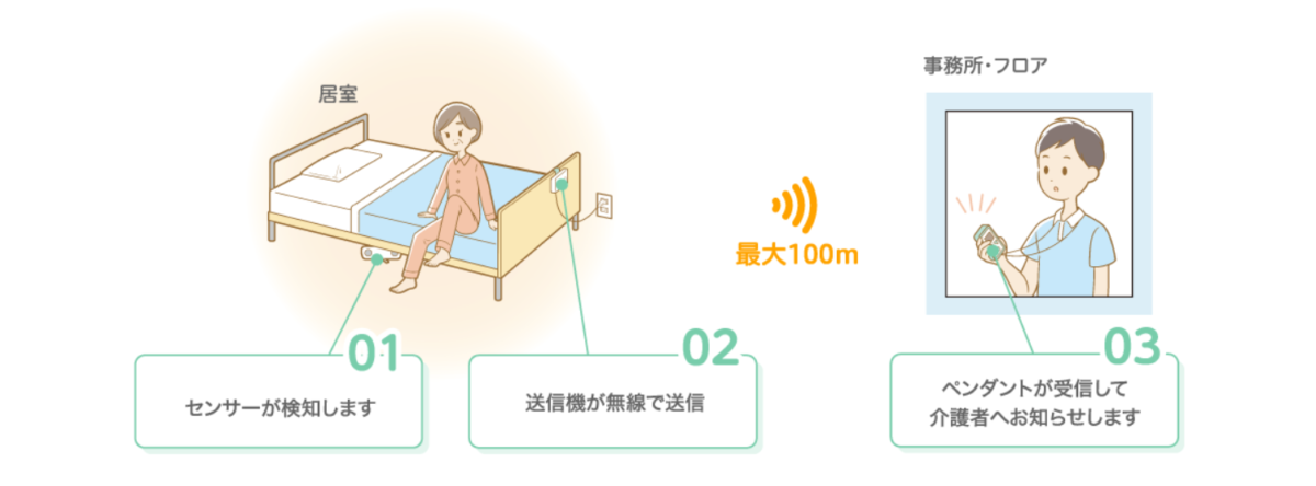 - 強み: カメラで監視されることに抵抗がある方でも、超音波ならプライバシーを守りつつ「起き上がり」や「端座位」をピンポイントで検知できます。既存のナースコールと簡単に連動できるだけでなく、1.5km先まで届く長距離無線モデルもあり、建物が分かれている施設でも工事不要で導入可能です。